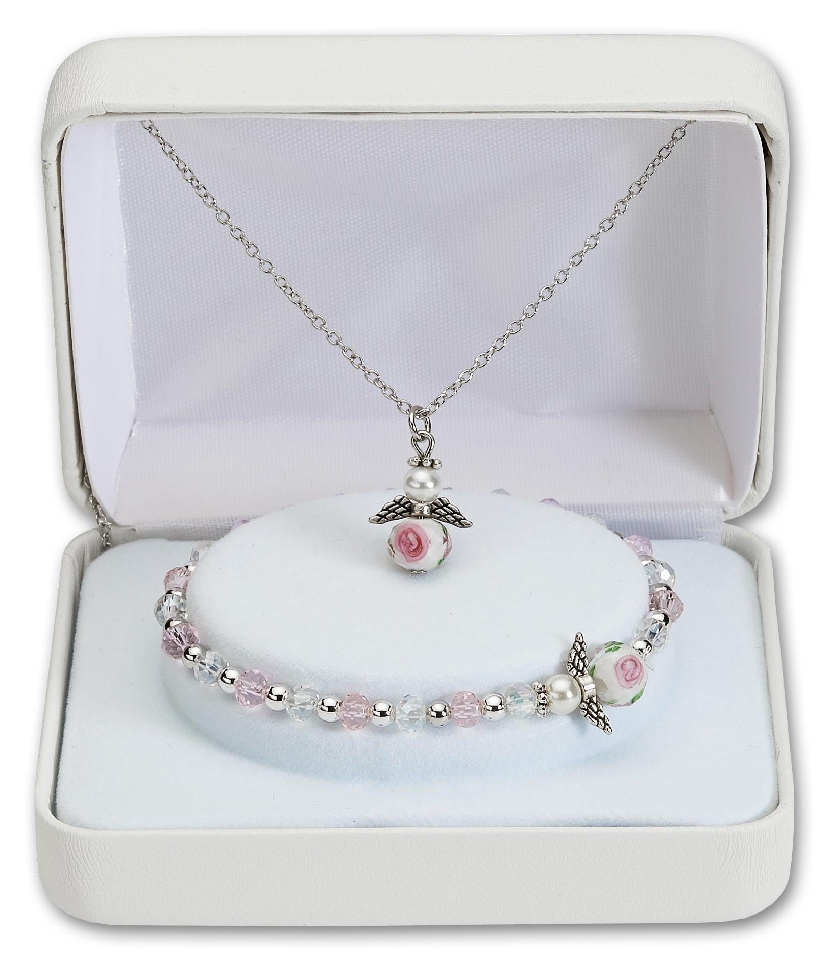 This angel-inspired jewelry set includes a necklace and matching stretch bracelet, designed with delicate details and meaningful accents. Each piece features: Angel charm with pearl and...